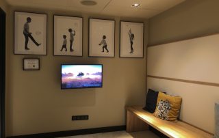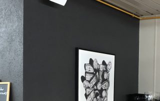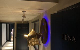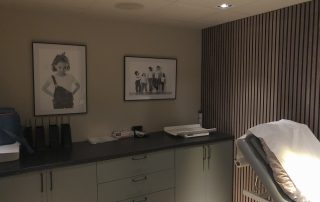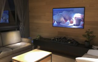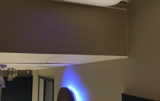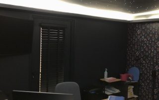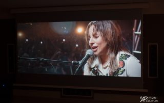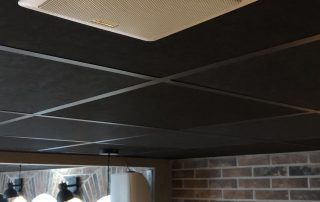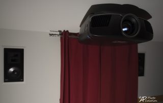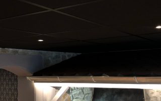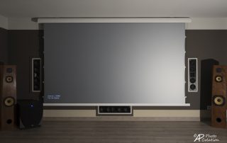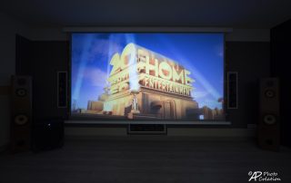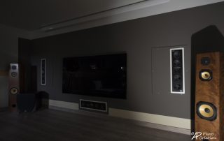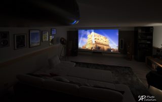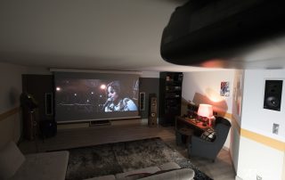Les équipements ont été (dans la mesure du possible) intégrés dans les murs et dans un caisson conçu sur mesures pour le vidéoprojecteur et les haut-parleurs Atmos.